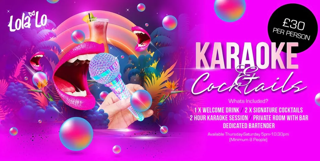 Our 2-hour Karaoke & Cocktails sessions are designed for pure fun, priced at £30 per person (minimum group of 8).
